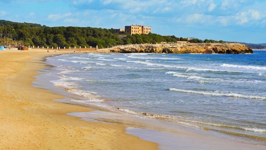 Пляж у замка Тамарит — открытка Коста-Дорада. Замок на скале, золотой песок, спокойная вода и зелёные склоны вокруг создают очень кинематографичный вид. Это удачное место и для купания, и для романтических прогулок, и для фотографий на фоне крепости и моря.